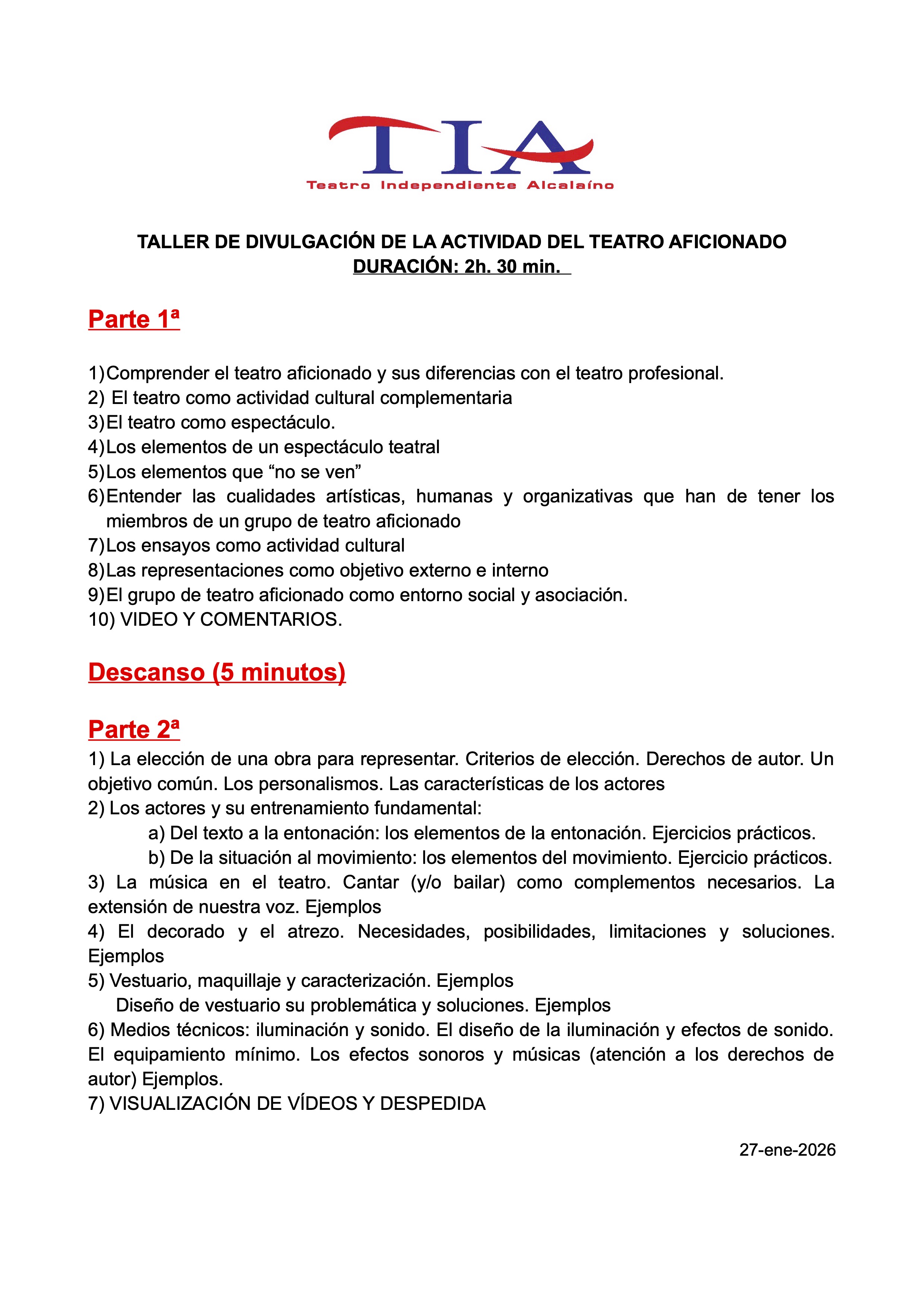 - Aviso importante: El aforo de esta actividad está limitado a 25 personas. Se respetará el orden de las inscripciones aceptadas de las personas que lleguen a la sala a la hora de iniciarse el evento. La inscripción se realizará enviando un email a tia@tiateatro.org indicado en el asunto TALLER DIVULGACION TEATRO AFICIONADO y comunicando el nombre completo de la persona que se inscribe y su edad. Se enviará un email por cada persona. Todos los emails recibidos serán contestados asignando un número de inscripción según el orden en que lleguen.